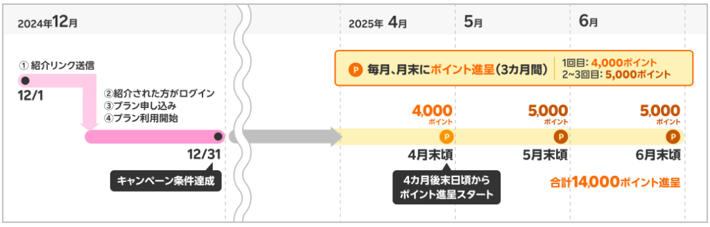 「自分がいつもらえるか」をイメージしやすいよう、月別の具体例を紹介します。従業員紹介でMNP乗り換え(14,000ポイント)した場合のシミュレーションです。